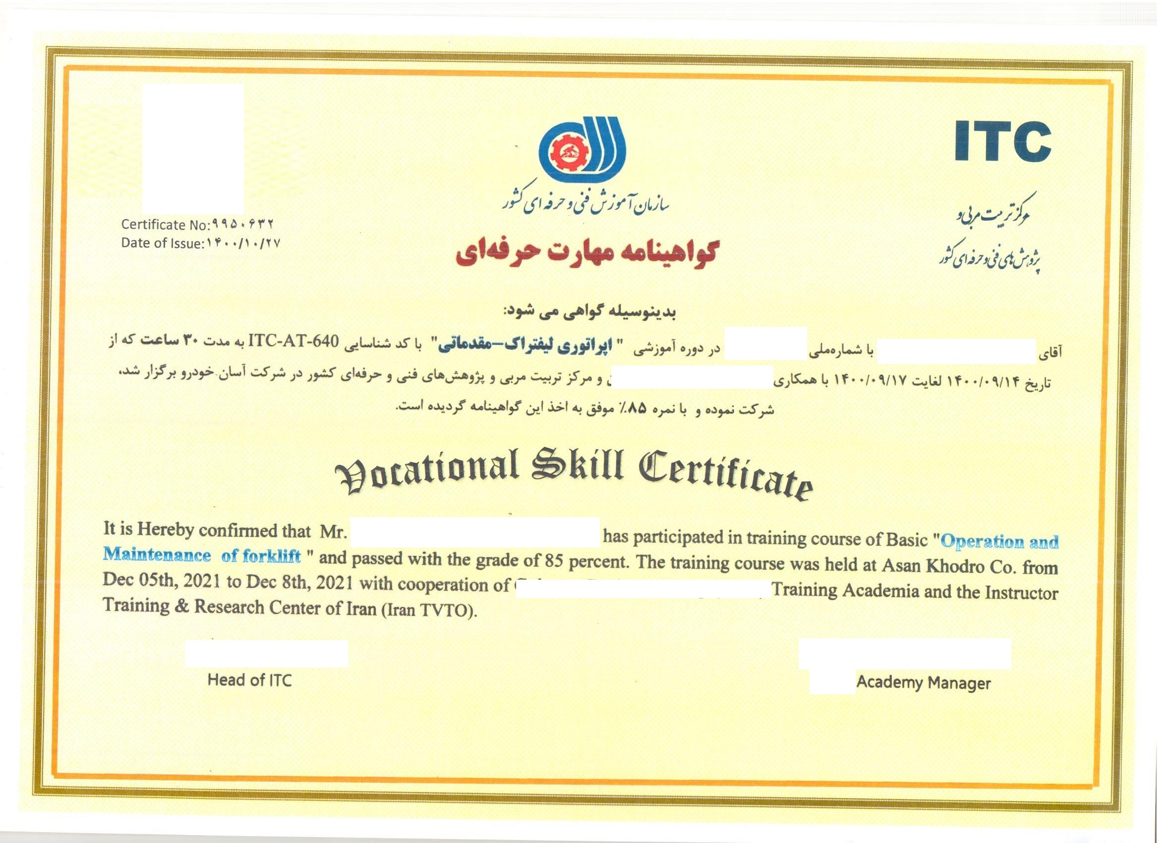 نمونه مدرك بين المللي صادر شده سازمان فني و حرفه اي