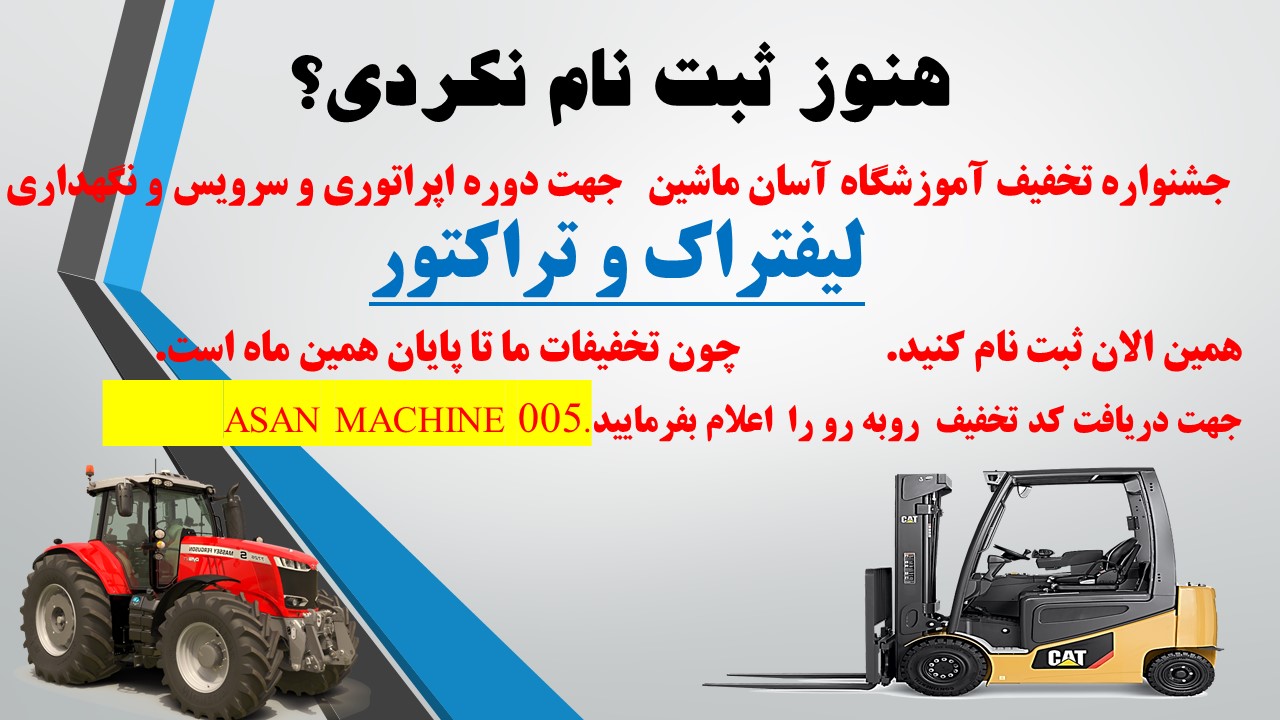 جشنواره تخفیف آموزشگاه آسان ماشین جهت دوره اپراتوری و سرویس و نگهداری لیفتراک و تراکتور همین الان ثبت نام کنید. چون تخفیفات ما تا پایان همین ماه است.