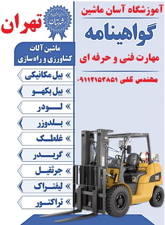 آموزش رانندگی بیل زنجیری-آموزش رانندگی بیل بکهو-آموزش رانندگی لیفتراک بنزینی دیزل دوگانه سوز و برقی-آموزش رانندگی تراکتور- آموزش رانندگی کمباین- آموزش رانندگی چاپر -آموزش رانندگی لودر چرخ لاستیکی -آموزش رانندگی مینی لودر بابکت-آموزش رانندگی دامپتراک -آموزش رانندگی جرثقیل-آموزش رانندگی غلتک-آموزش رانندگی بلدوزر-آموزش رانندگی چکش تخریب- آموزش رانندگی بالابر تلسکوپی-آموزش رانندگی ریچ استاکر