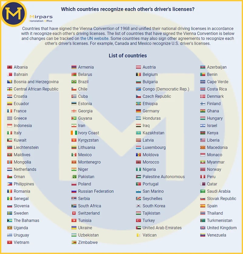گواهینامه ایرانی در ۹۸ کشور عضو کنوانسیون ژنو دارای اعتبار است. کشورهای بزرگی همچون انگلستان، آلمان، فرانسه، ایتالیا، اسپانیا، هلند و ترکیه عضو این کنوانسیون بوده و گواهینامه ایرانی را قبول دارند و شما میتوانید با ارائه ترجمه رسمی آن در این کشورها رانندگی کنید. در تصویر زیر میتوانید لیست کامل این ۹۸ کشور را مشاهده نمایید.